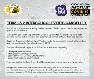 We received information late yesterday that School Sport WA has made the decision to cancel all inter-school sport competitions for Terms 1 & 2 this year. This cancellation includes Senior High Schools Country Week. While our students will be disappointed with this decision, School Sport WA has made the decision for the long term health and welfare of everyone in the community.